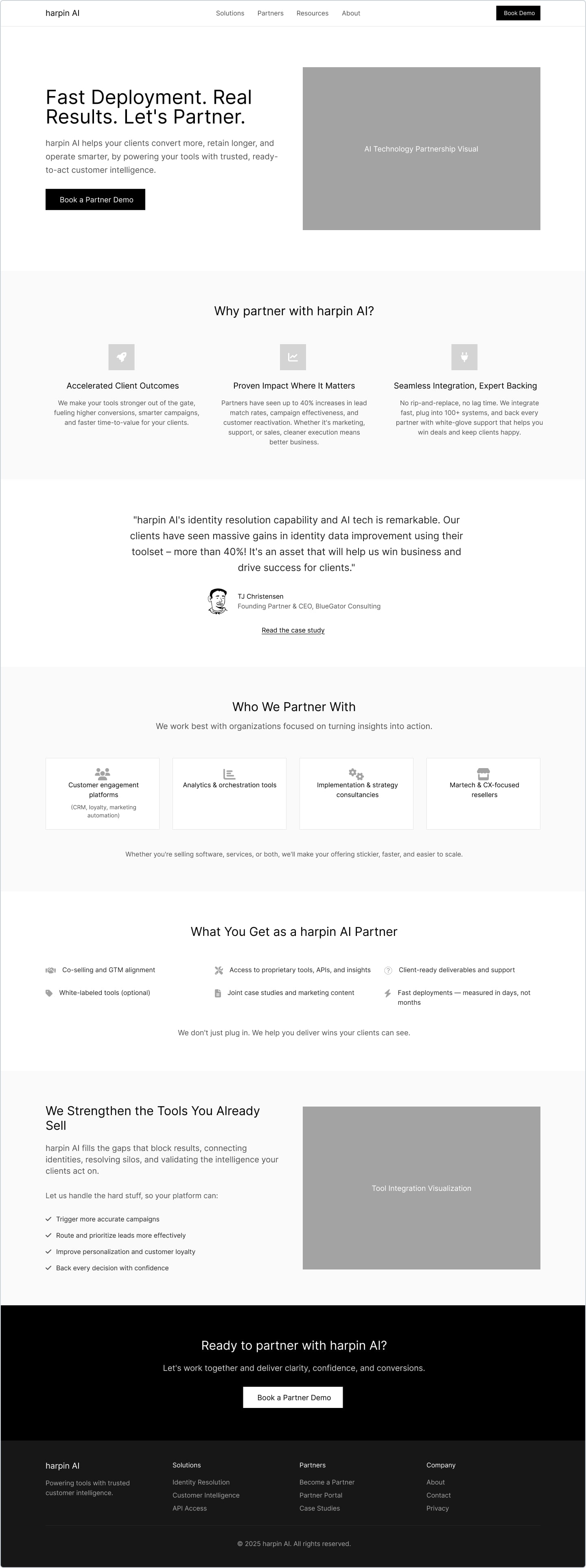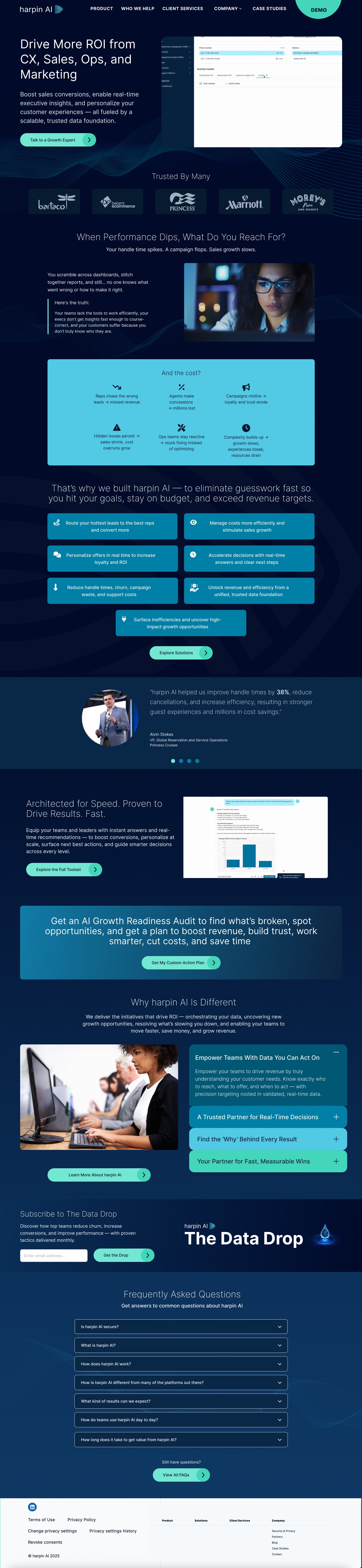 3. Structure drives action: A clear flow—hero value prop → trusted by many → pain points → solution benefits → proof points—helps buyers understand Harpin’s edge and leads them toward conversion (demo requests, growth audit, or newsletter sign-up).