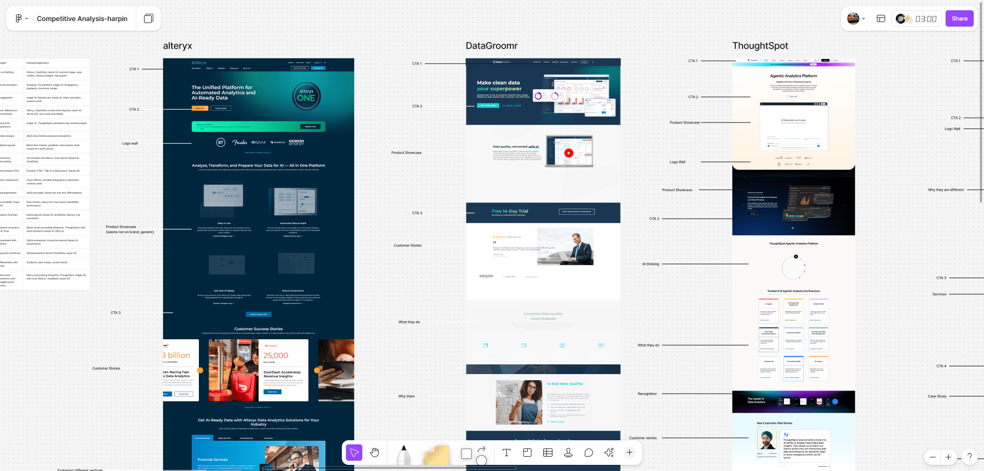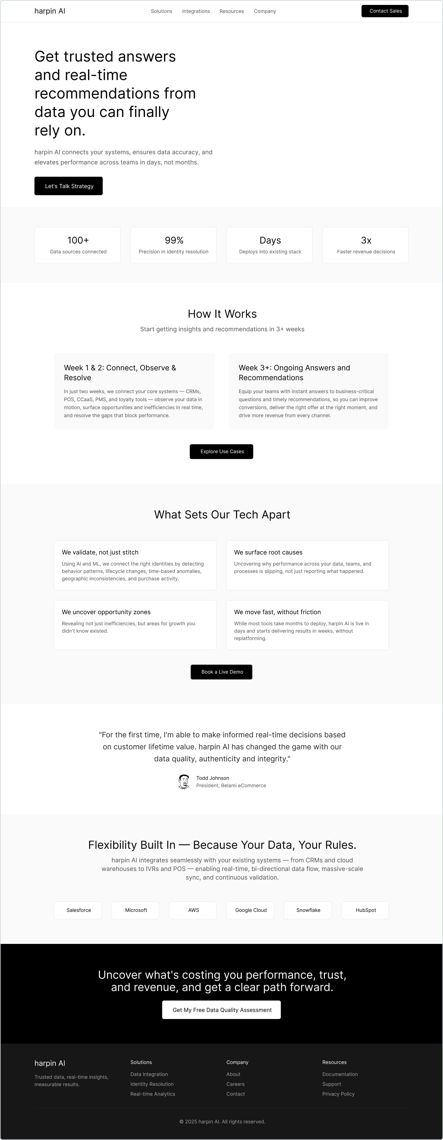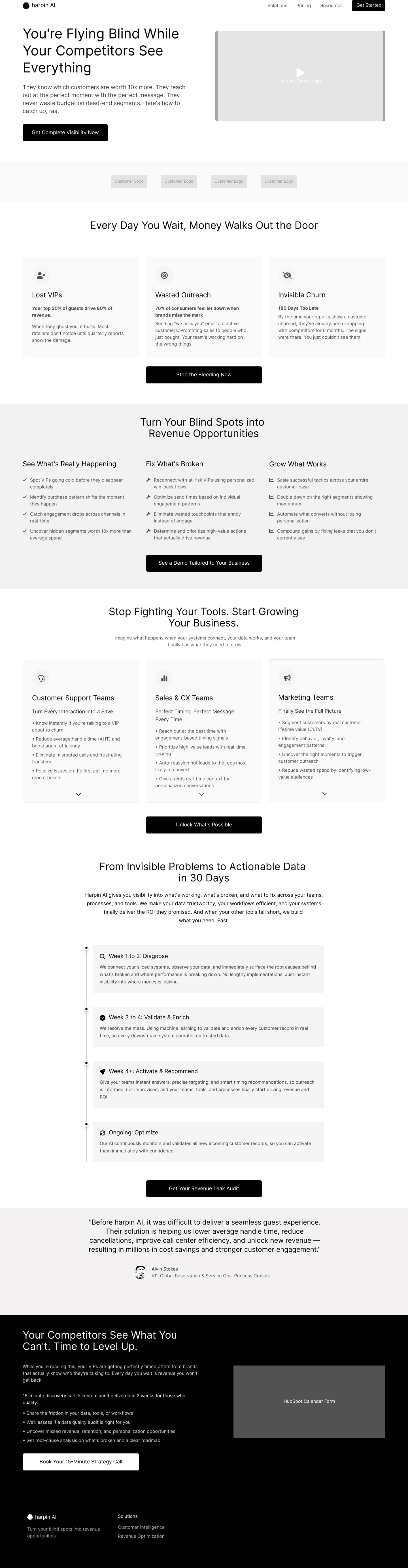 Market Opportunity: Competitors follow predictable structures—hero headline, logo wall, 3-value-prop cards, testimonial blocks—but often lack a compelling narrative around *actionable insights at scale*. Harpin can own this story by emphasizing how executives and operators can act in the moment, not after the fact.