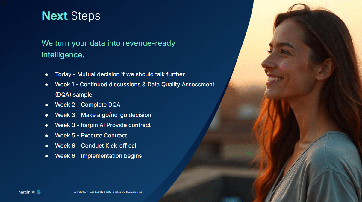 If we completely redesign Harpin AI’s enterprise slide deck with bold, outcome-focused headlines, streamlined visuals, and clear storytelling, then prospects like Princess Cruises will better understand the value proposition, increasing engagement during presentations and improving conversion opportunities within the first 60 days of use.